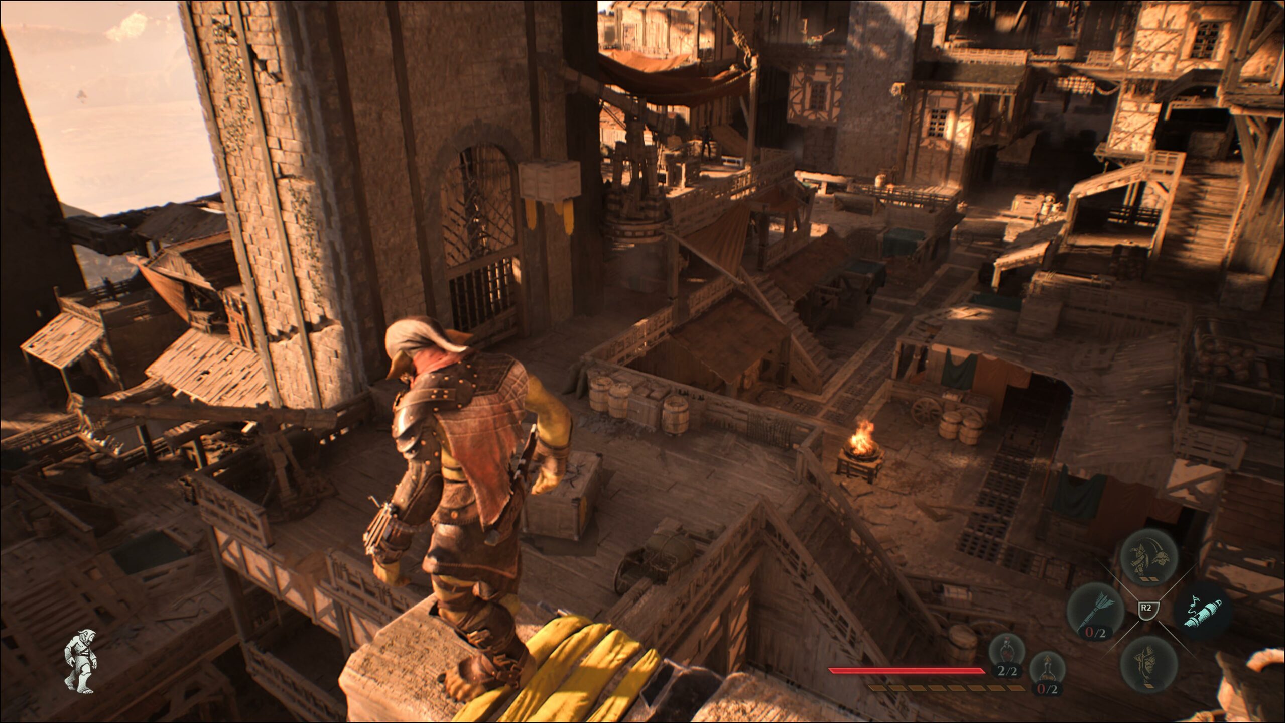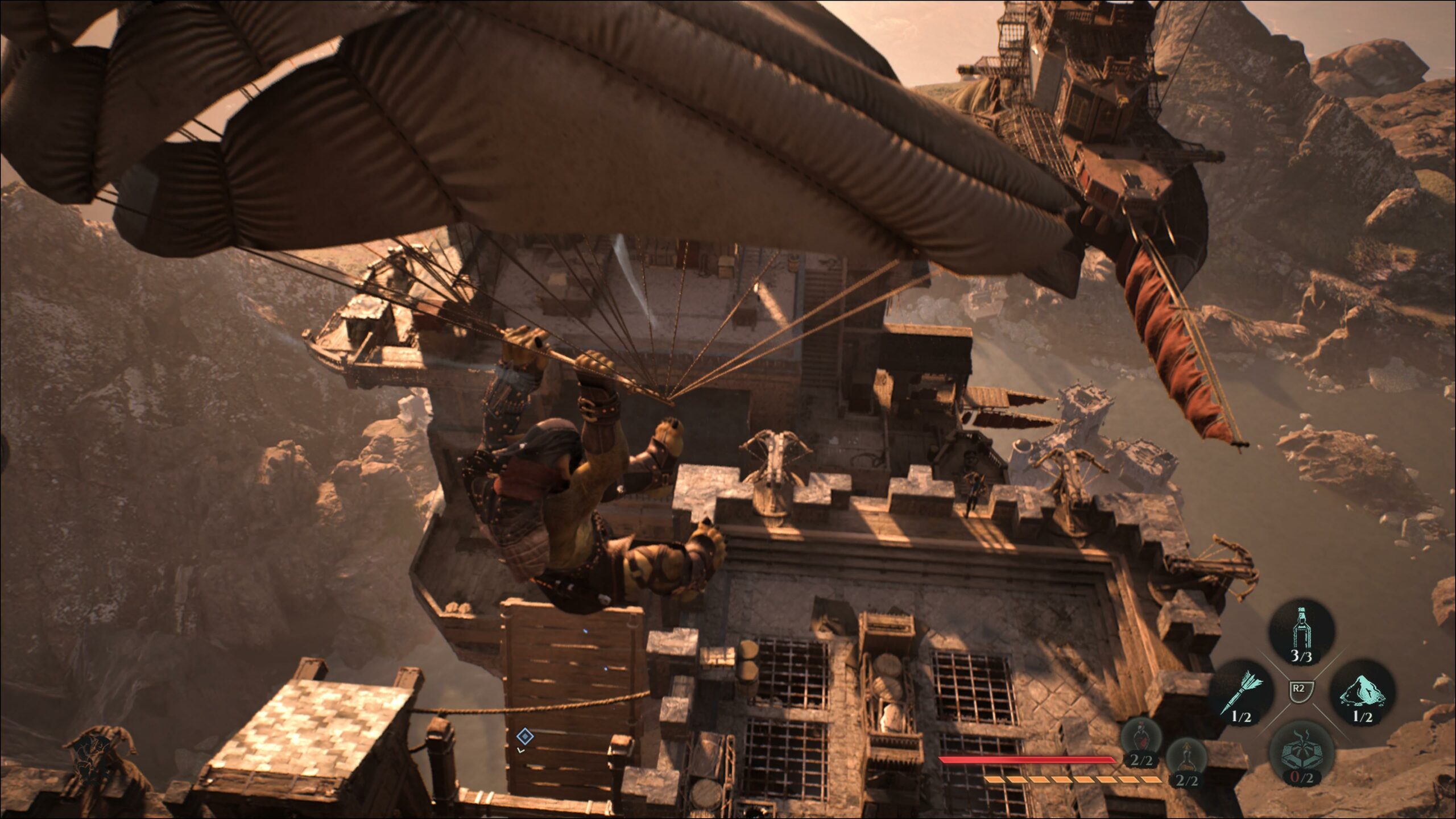 Je dois dire que j’ai trouvé le début du jeu rugueux et pas très accueillant pour les nouveaux joueurs ou ceux qui gardent peu de souvenir de Shard of Darkness. J’ai en effet eu l’impression que le jeu s’adresse en priorité aux joueurs déjà familiers avec la série et ses mécaniques de gameplay. D’ailleurs ce n’est pas qu’une impression puisque le tutoriel du jeu est optionnel et on peut facilement passer à coté. Plus généralement, Blades of Greed manque d’outils pour guider les joueurs efficacement, au moins pendant les premières missions. Ainsi, certains objectifs principaux ne sont pas marqués automatiquement et j’ai erré pendant des heures avant de comprendre qu’il faut utiliser la boussole puis marquer manuellement un objectif avec R3. Mais mon plus grand regret reste le fait que le jeu est dépourvu d’une carte en temps réel qui, étant donné le level design très vaste et vertical, aurait été d’une grande aide pour se repérer ou retrouver l’embarcadère le plus proche.