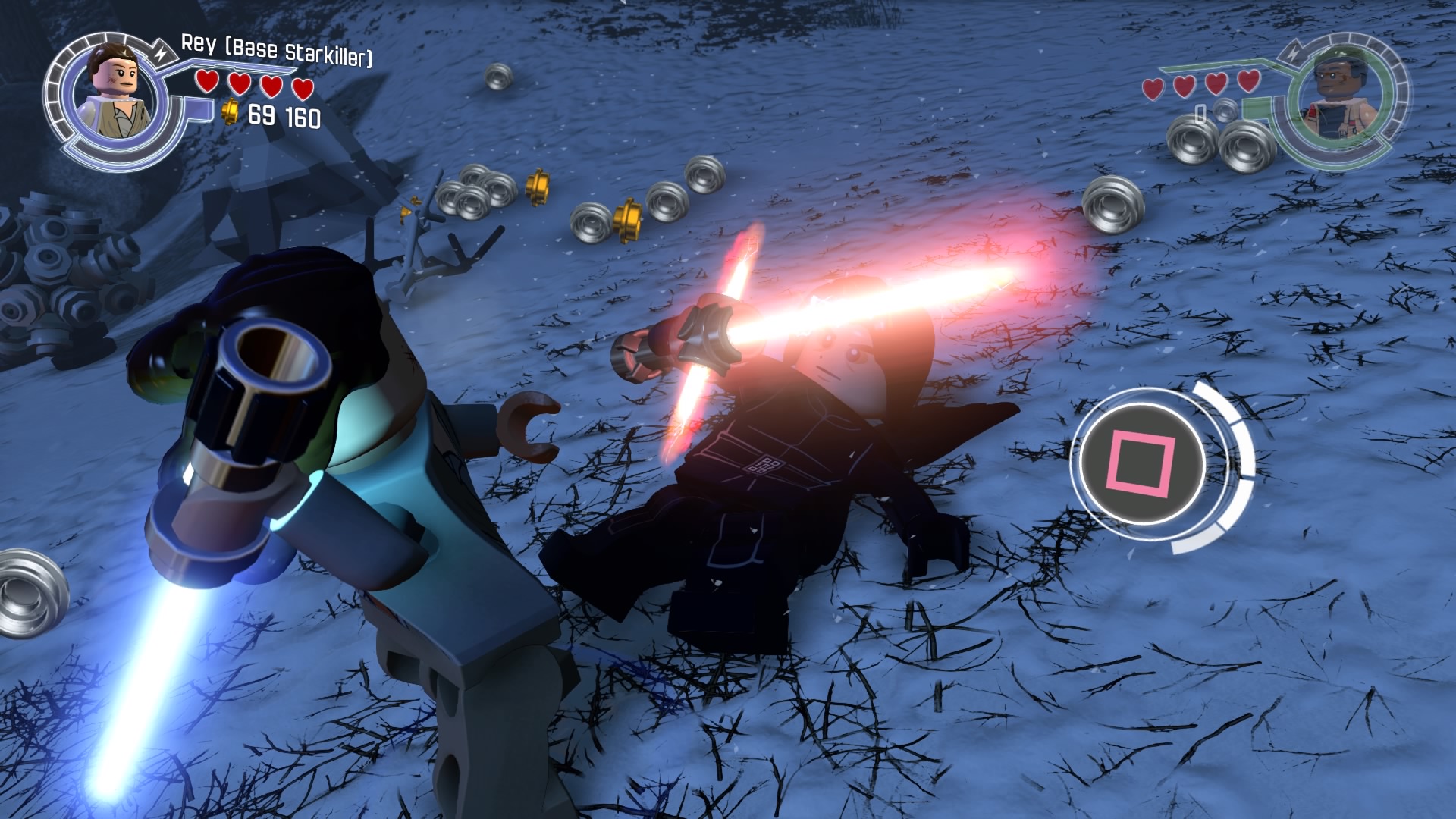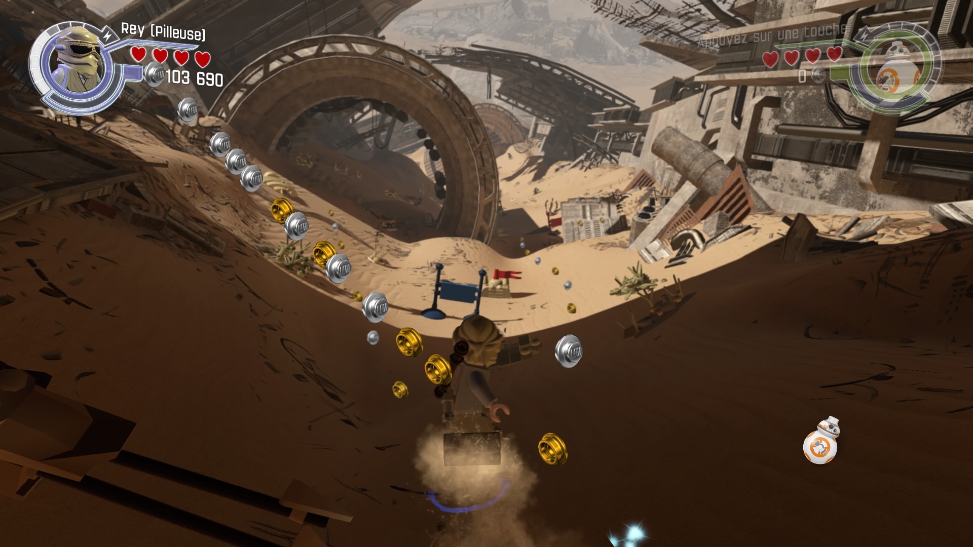 Mine de rien c’est un vrai plaisir pour le fan dont je suis de rejouer les scènes du film d’autant qu’elles sont ici rallongées pour le besoin du level design. On trouve également de nombreuses scènes absentes de Star Wars VII sous forme de niveaux bonus. C’est le cas du récit de la capture des Rathtar par Han Solo et Chewbacca ou de l’obtention du fragment de la carte contenant les coordonnées de Luke sur Jakku. Mais ce ne sont pas les seules nouveautés concoctées par Tt Games pour ce LEGO Star Wars…