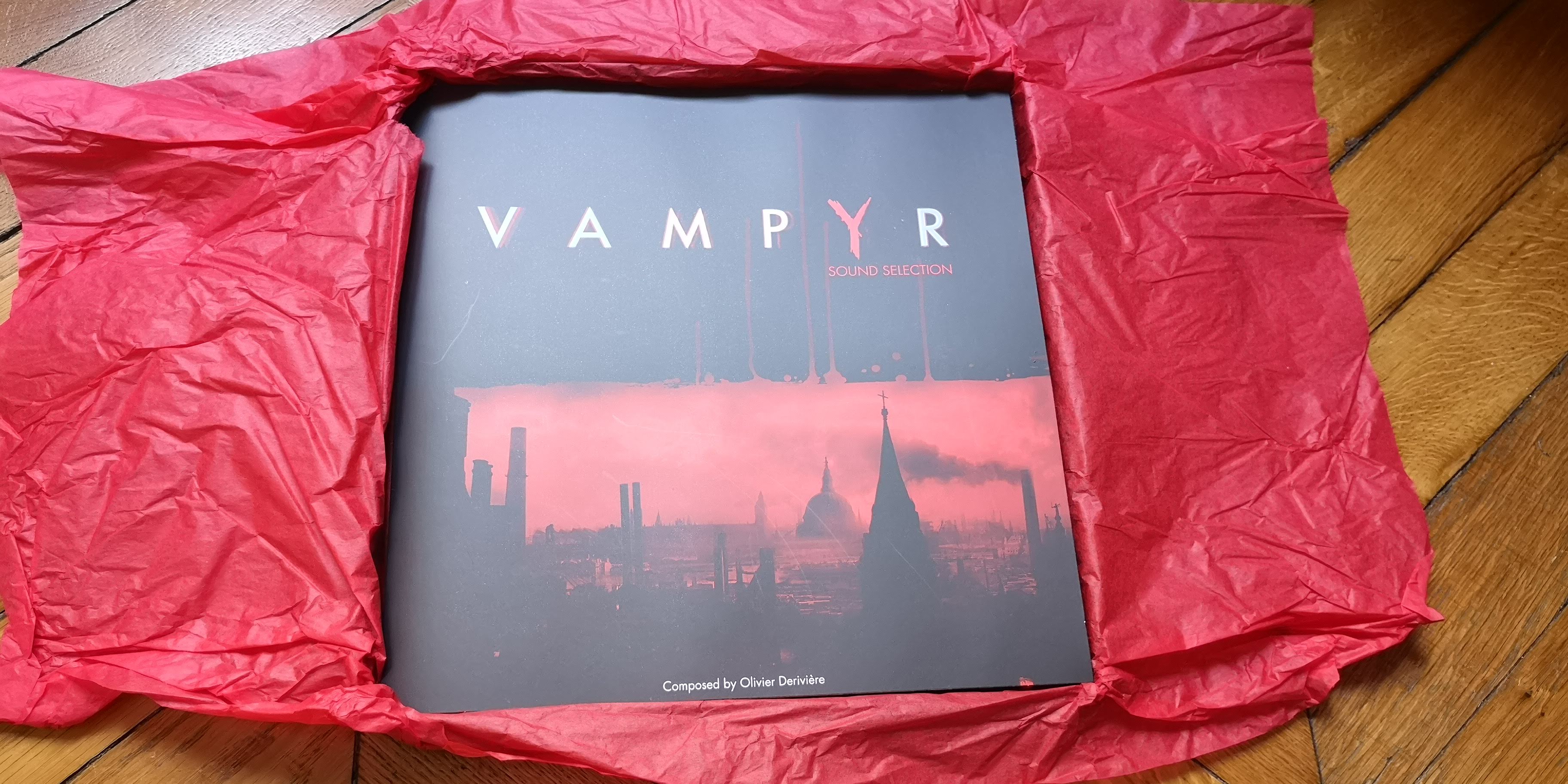 Le press kit se présente sous la forme d’une grande boite noire peu profonde sur laquelle est inscrit le logo du jeu. A l’intérieur, du papier de soie rouge protège le contenu du press kit à commencer par un superbe vinyle d’une quinzaine de morceaux, choisis parmi la bande originale de Vampyr composée par Olivier Derivière, à qui l’on doit notamment les bandes originales de très nombreux jeux Focus Home (Of Orcs and Men, The Technomancer, The Council), mais aussi des jeux plus éloignés comme Alone in the Dark ou Assassin’s Creed IV: Black Flag. Les mêmes titres sont également proposés en téléchargement pour ceux comme moi qui ne sont pas équipés d’une platine !