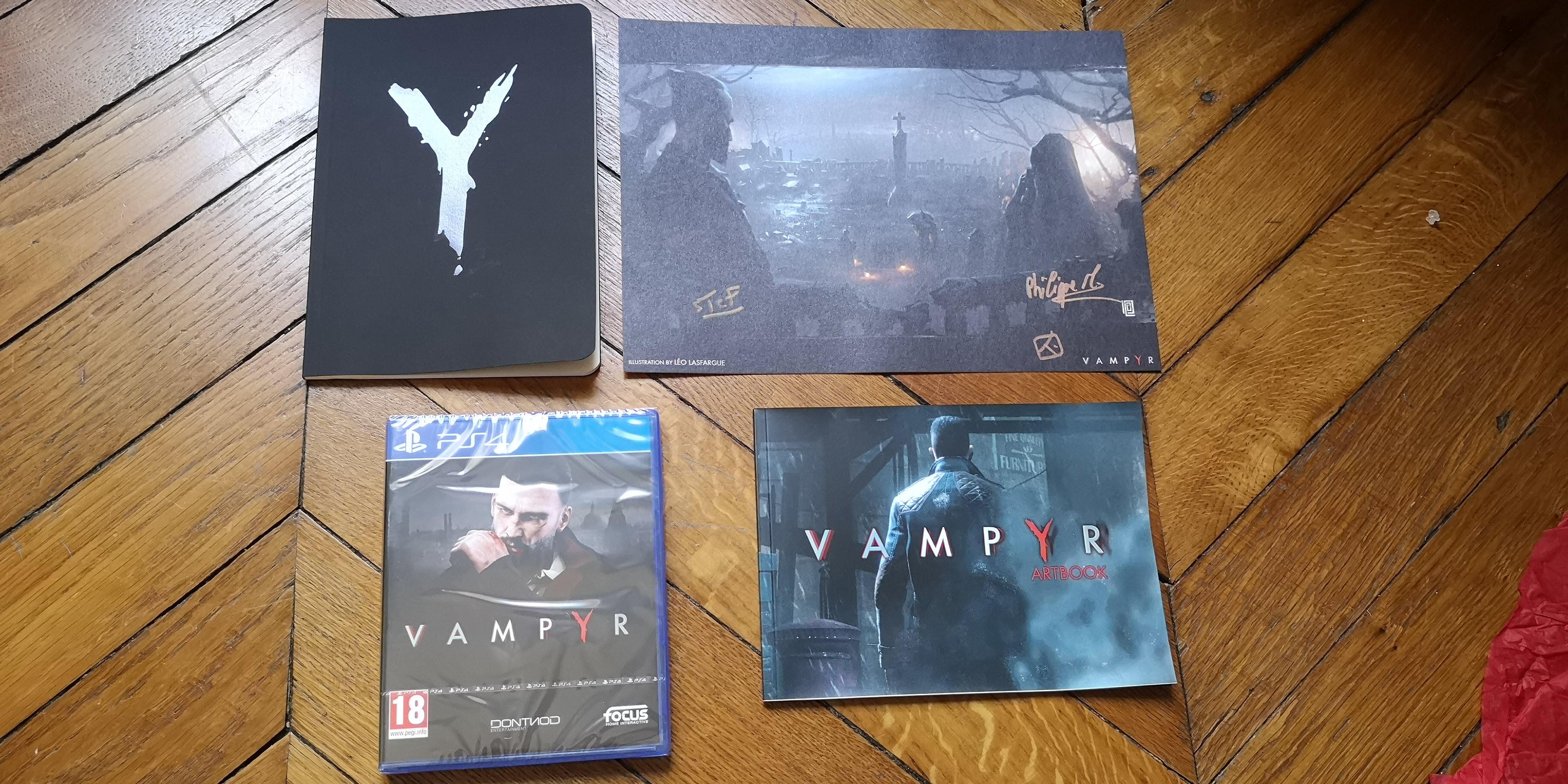 Enfin, derrière la litho précédente se trouve un exemplaire du jeu sur PS4, un bloc-notes marqué du « Y » de Vampyr et un mini artbook que j’ai feuilleté rapidement histoire d’éviter les spoils !